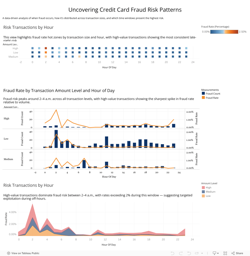 Credit card fraud is a costly and growing challenge for financial institutions. In this project, I explored over 280,000 real-world transactions to uncover patterns in when and how fraud occurs. Using SQL and Tableau, I built an interactive dashboard to visualize fraud risk across time of day and transaction amount, revealing that high-value fraud peaks between 2–4 AM. Building on these insights, I then developed a machine learning model to predict fraudulent transactions with strong performance and practical application for banks and fintech companies.