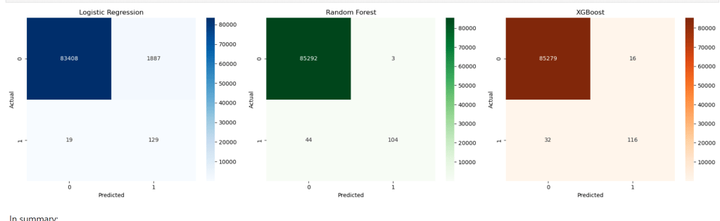 XGBoost delivers the most practical mix of catching fraud while limiting false alarms, making it the preferred engine for live fraud-detection systems. Logistic Regression can serve as an upstream net to ensure extreme coverage, and Random Forest is valuable when minimizing customer disruptions is paramount.