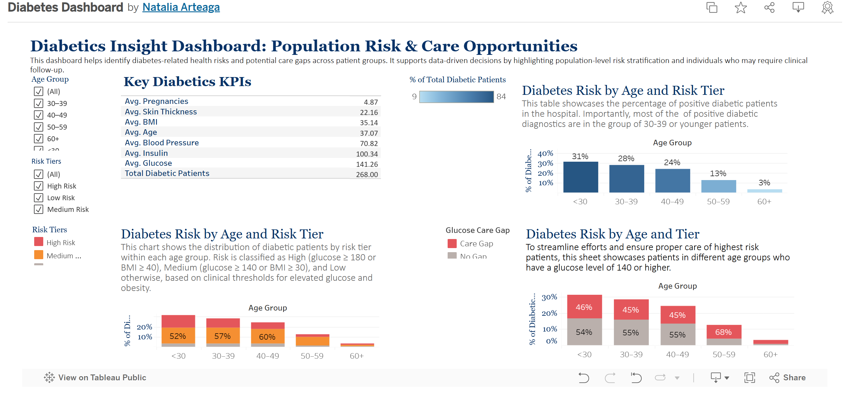 Inspired by my father’s Type 1 diabetes diagnosis, I harnessed real-world clinical data to build an interactive Tableau dashboard that maps key health indicators—glucose levels, BMI, and demographic factors—into clear risk tiers. The dashboard highlights trends and care gaps, delivering actionable insights for earlier detection, targeted outreach, and better patient management. Lastly, I created a machine learning model to predict future diabetes incidences. Ultimately, this project aims to demonstrate how data science can translate complex clinical signals into practical tools that change lives.